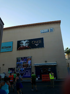 We grabbed our water and bannana and headed down to the lobby where we each grabbed a bagel and the hubby got a coffee. About 4:45 we decided to head out to the corrals only for me to realize that I forgot my hair tie & to put deodorant on. I figured I would be nice to all those around me I ran back up to the room and put on deodorant and grabbed my hair tie then it was off to our corral. We were in corral G and were surprised how close to the front we got of the corral. So we hung out for a bit and then it was time to get running.